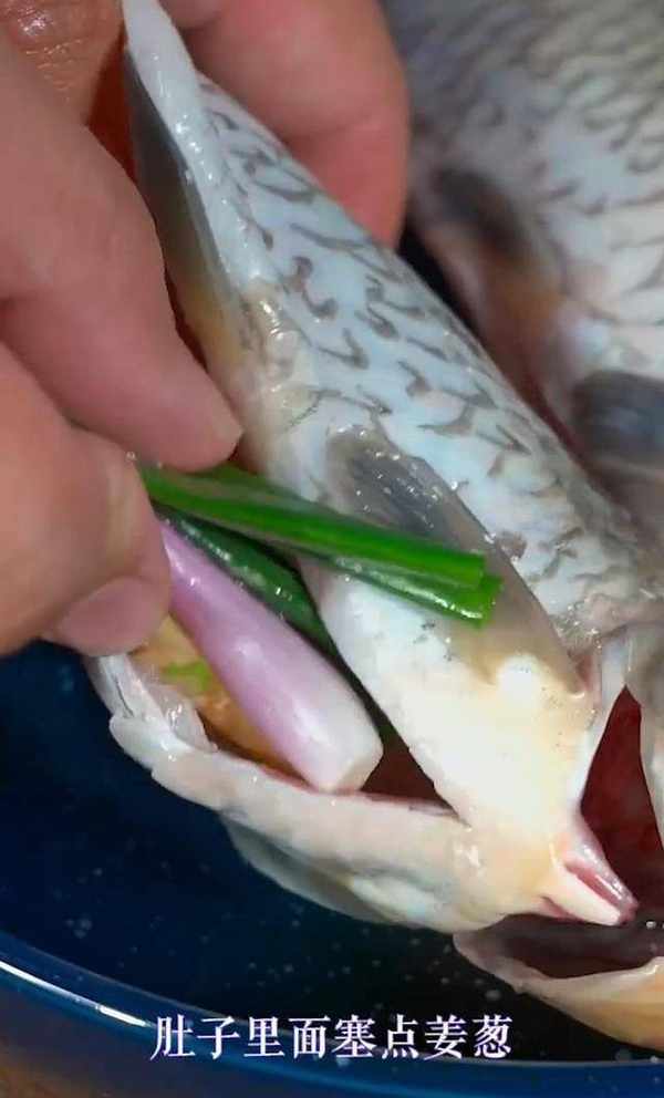 首先先去掉肚子裡面的黑膜,再改上發刀,方便入味,加點高度白酒和鹽,塗抹均勻,醃制十分鐘。肚子裡面塞點薑蔥,蒸鍋上氣,開大火蒸八分鐘,這個時候準備點青紅辣椒剁碎。