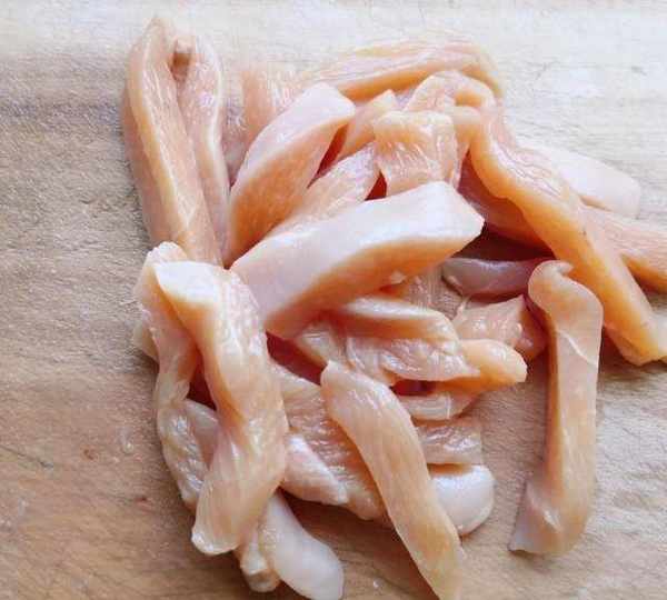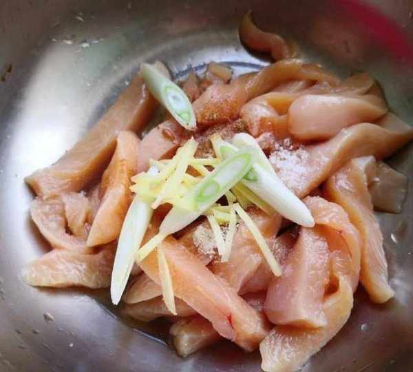 第4步、雞肉條放到容器裡,加入佐料和蔥薑,用手反復抓均勻,讓雞胸肉更入味。