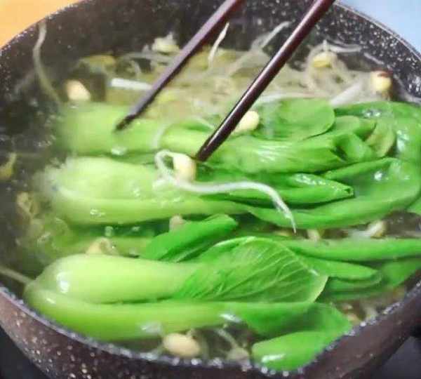 第7步、將青菜、黃豆芽放入鍋中焯熟,撈出放入碗中備用,這裡的配菜可以根據自己的喜好隨意選擇。