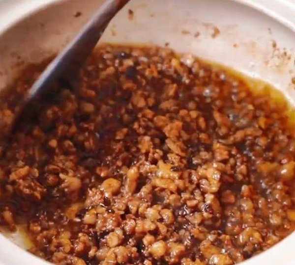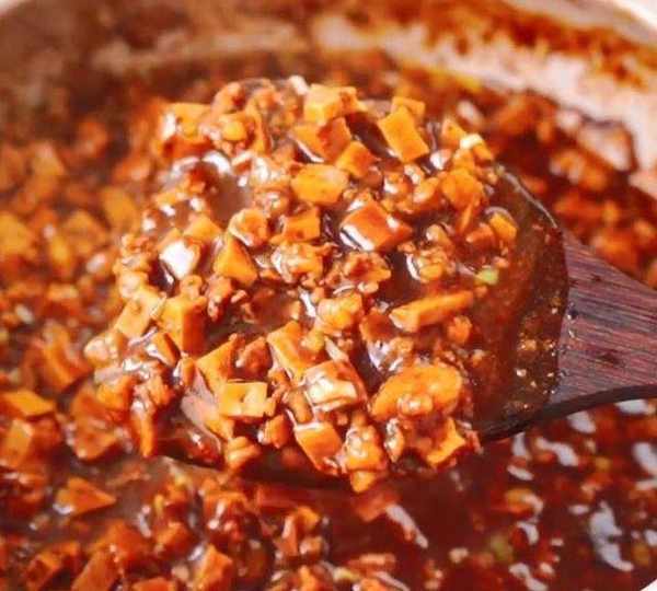 第6步、倒入水淀粉,煮至濃稠,然後撒上蔥花,攪拌均勻,出鍋,炸醬面的醬汁就熬好瞭(炸醬面好吃的秘密就在醬汁中)。