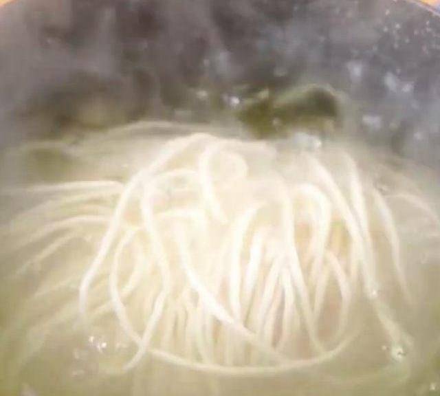 第8步、煮青菜的清水下入面條,攪拌攪拌防止粘鍋,煮熟後撈出放入碗中。