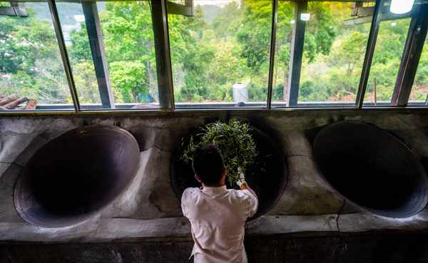 這是2023年5月17日,中國雲南省勐海縣佈朗山佈朗族鄉的茶農在炒茶。新華社記者 江文耀 攝