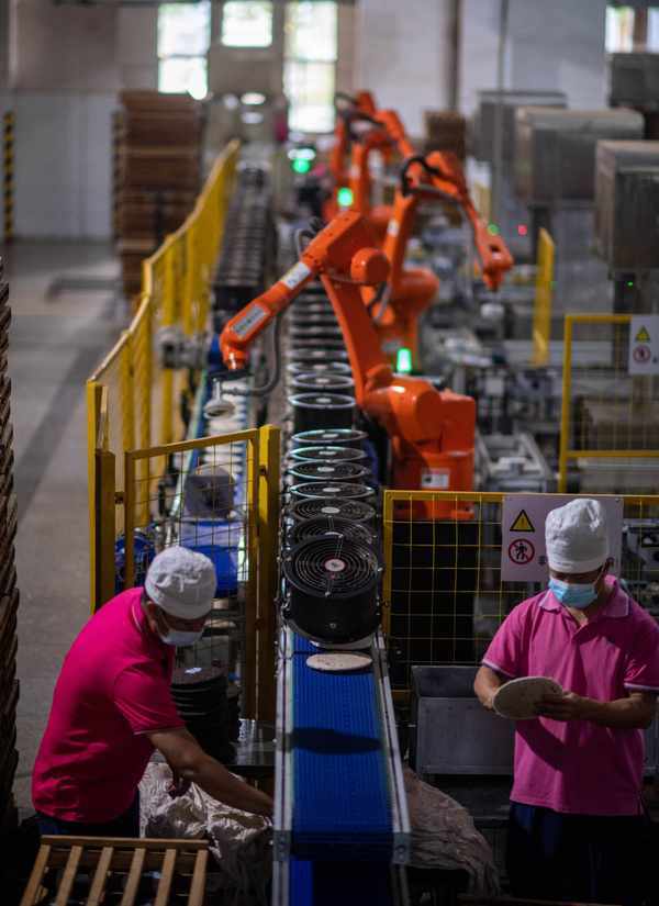 這是2023年5月18日,中國雲南省勐海縣勐海茶廠的工人在自動機械臂的協助下分揀包裝普洱茶餅。新華社記者 江文耀 攝