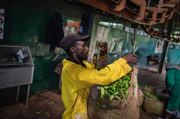 這是2023年5月4日,工人在肯尼亞首都內羅畢附近的茶廠裡搬運茶葉。 新華社記者 王冠森 攝