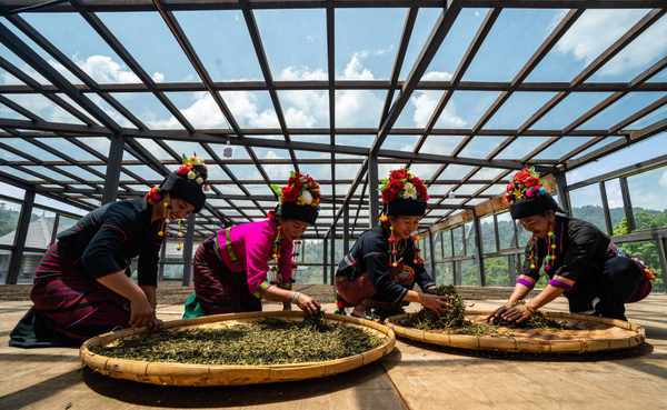 這是2023年5月17日,中國雲南省勐海縣佈朗山佈朗族鄉的茶農在晾曬茶葉。新華社記者 江文耀 攝