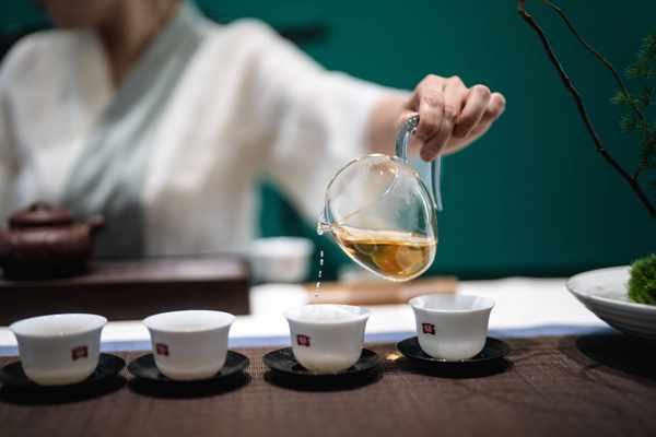 這是2023年5月18日,中國雲南省勐海縣勐海茶廠的茶道師在展示茶道。新華社記者 李木子 攝