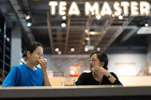 這是2023年5月18日,兩名茶客在中國雲南省勐海縣一處茶館品嘗普洱茶。新華社記者 李木子 攝