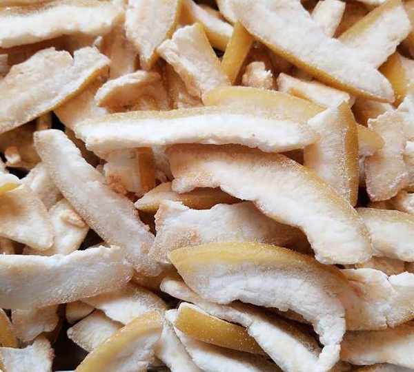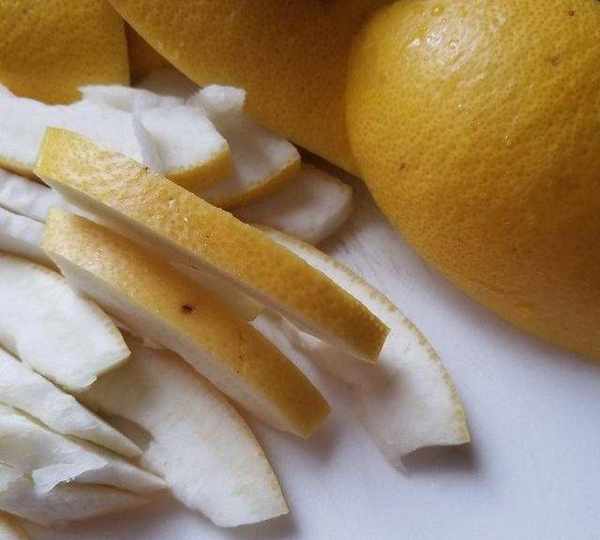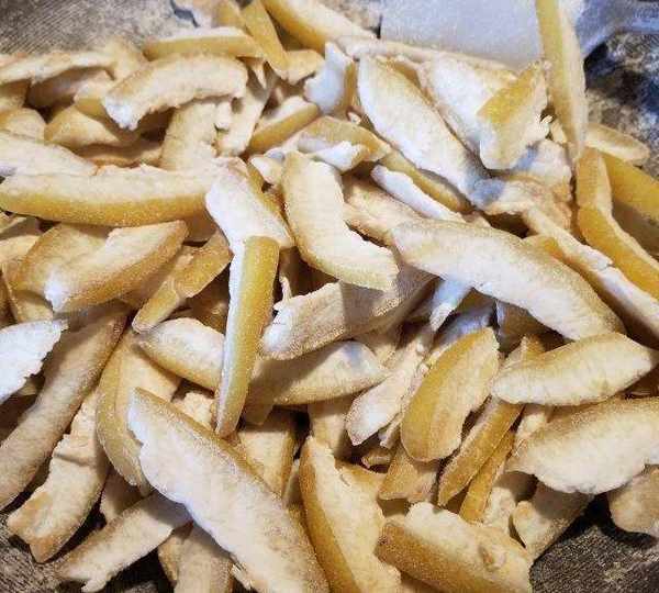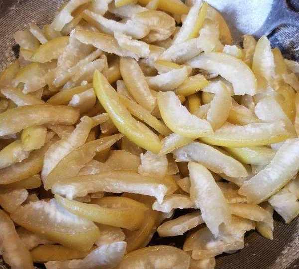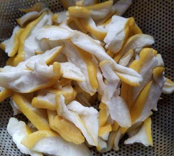 第4步、把柚子皮切均勻薄片。
