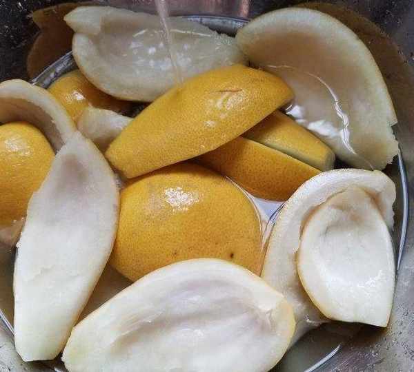 第5步、把柚子皮片泡水裡使勁抓捏,換水,我換瞭7-8遍的水,直到水比較清。(太費水瞭,用的水都可以澆一遍院子裡的花瞭。)