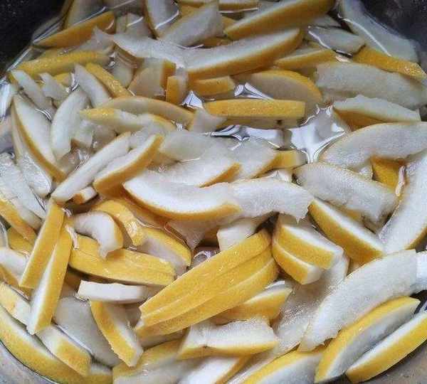 第6步、把柚子皮片冷水下鍋煮開,3-5分鐘,撈出沖涼水,然後再泡水裡抓捏,換2-3次水,取一點嘗嘗,沒苦味就可以瞭。