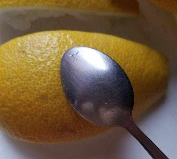 第2步、用不銹鋼勺子刮破柚子表面的顆粒,以便去其苦味。