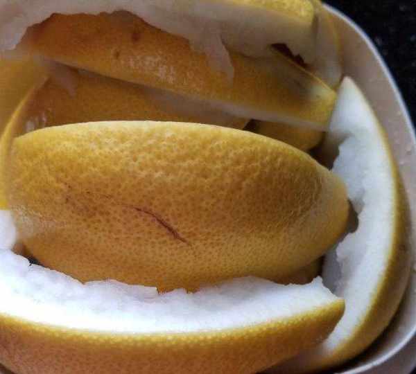 第1步、柚子皮用鹽搓洗幹凈。