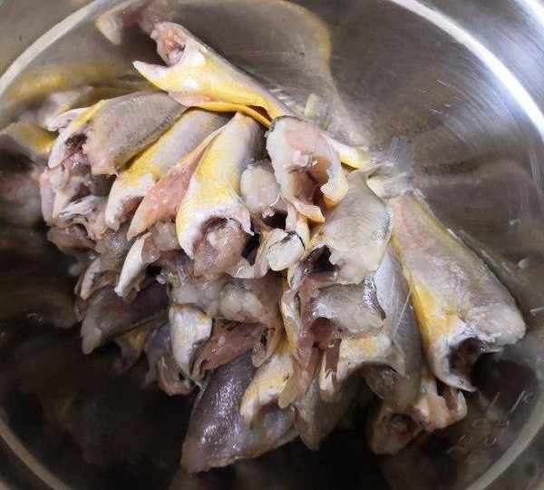 第1步、小黃魚去頭,用廚房剪刀剪開魚肚去掉所有內臟,清洗幹凈,瀝幹水分。
