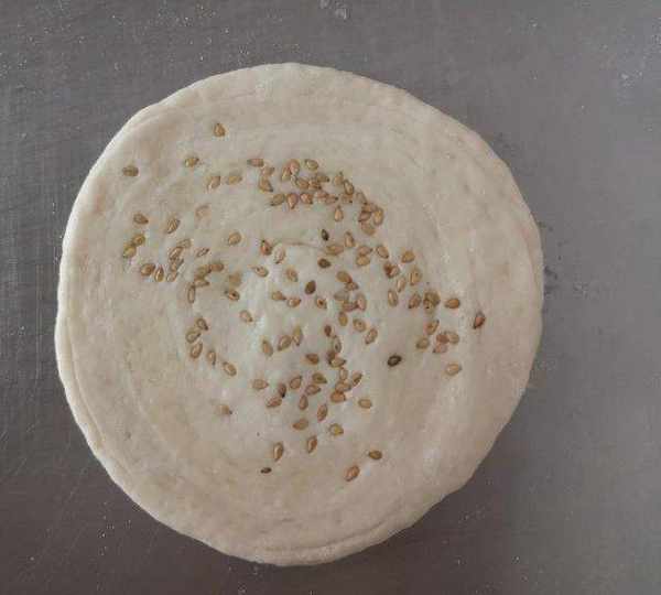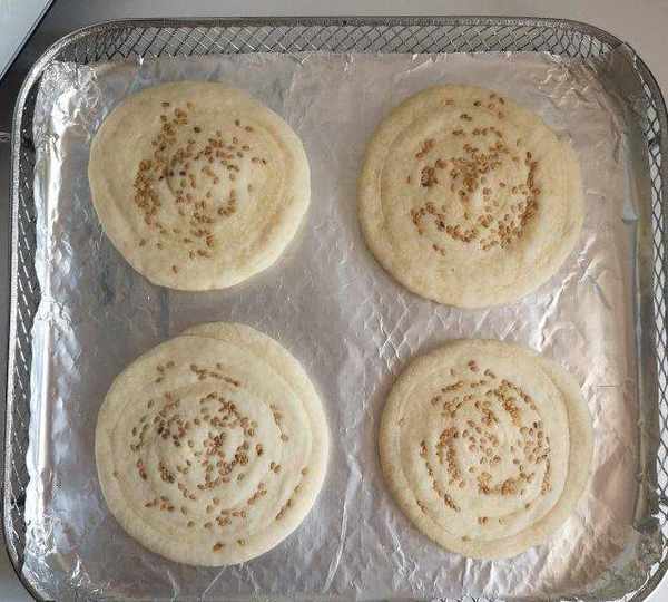 第10步、將面團搓長後盤起來,撒上白芝麻,再搟成圓形餅,放置一邊繼續發酵,我做瞭四張餅。