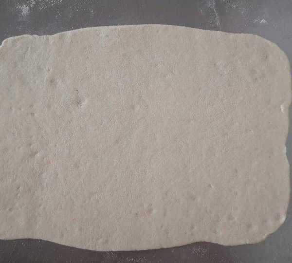 第7步、面團在面板上揉幾下排排氣,分成2份(我的面板小,所以分開操作),取一份面團搟開,搟薄。