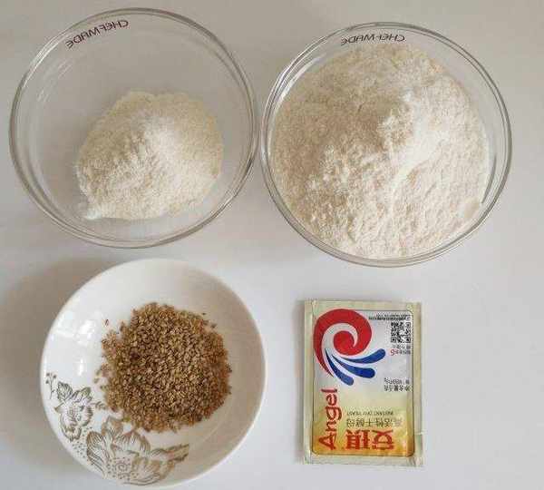 第1步、準備好面粉(主面團和油酥部分)、白芝麻和酵母粉。