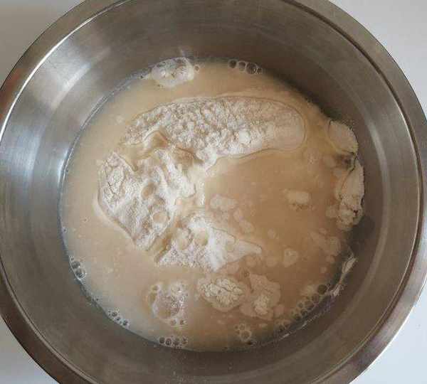 第2步、清水和酵母粉混合均勻後,倒入面粉中。