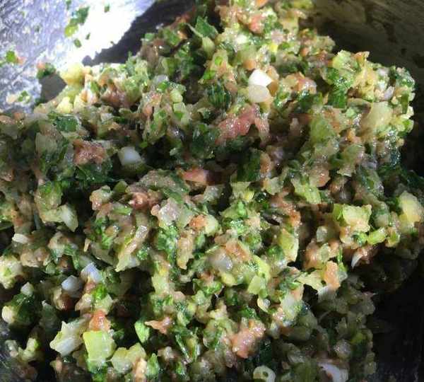 原料:面粉、溫水、豬肉、芹菜、蔥、香菜、油、鹽、五香粉、薑粉、醬油、醋、辣椒粉。