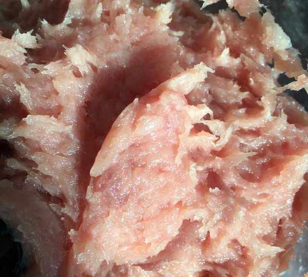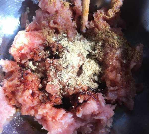 第5步、肉泥中加鹽,五香粉,薑粉,醬油,用熱油淋入激出香味兒攪拌上勁。