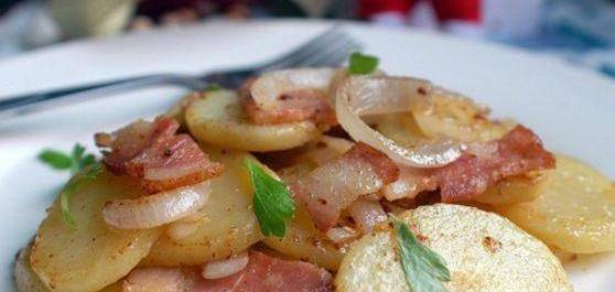 培根土豆:土豆洗凈,入鍋加水沒過土豆,加少量鹽煮15-20分鐘至土豆熟,涼後去皮切成厚片,燒熱鍋,放黃油化開,中火炒培根出香味後盛出,鍋中放洋蔥煸炒片刻,再加土豆煸炒,至洋蔥身軟,土豆外表金黃時加少許鹽和胡椒粉,放入培根炒勻出鍋裝盤,撒芹菜葉就完成瞭,是很美味的一道菜。