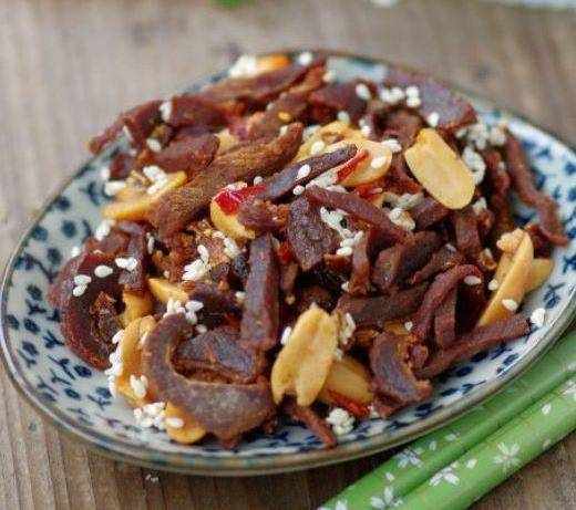 香酥臘牛肉:.臘牛肉洗凈切細絲,鍋中放寬油,燒至6成熱,放入牛肉絲,大火炸一分鐘,將牛肉絲撈出瀝幹油份,繼續加熱油至9成熱,再次放入牛肉絲,炸一分鐘,撈出牛肉絲,徹底瀝幹油份(也可用廚房紙將油份吸幹),牛肉絲放入一隻大碗,趁熱加入白芝麻,迅速攪拌均勻,加入麻辣花生,拌勻即可,讓人不得不愛的一道菜。