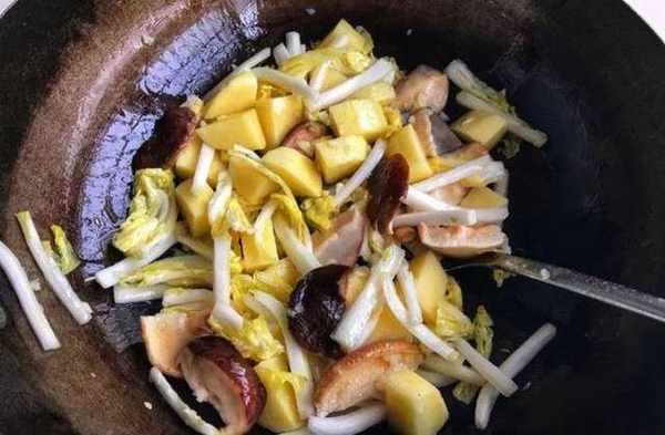 3、往鍋裡倒入少許色拉油,調成大火快速把油燒熱,然後迅速加入事先準備好的蒜末快速翻炒出香味,然後依次加入備好的白菜和香菇並繼續翻炒讓所有食材均勻受熱,最後加入切好的土豆進去,還是要不斷翻炒防止粘鍋。。