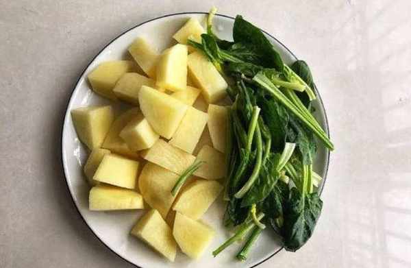 2、把馬鈴薯拿出來仔細去掉外皮,如果傢裡有專門去皮的刀會更加方便快捷,去皮之後切成大小差不多一致的小塊,接著把菠菜清洗幹凈,同樣註意清理掉根莖上的泥土 。