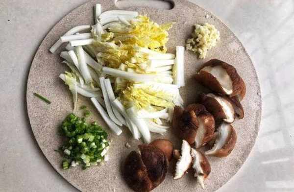 1、 首先來處理食材:將買回來的大白菜用清水洗幹凈,註意如果泥沙比較多一定要多沖洗幾遍,接著把白菜切成大小差不多的條狀,香菇先浸泡十來分鐘翻方便清洗,洗好後斜刀切,這樣切出來比較好看,將大蒜去皮之後用刀直接拍碎,小蔥洗幹凈之後切成蔥花。
