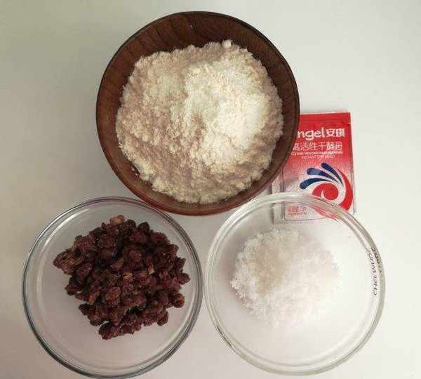 原料:面粉、紅豆餡、白糖、發酵粉、泡打粉、清水。