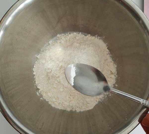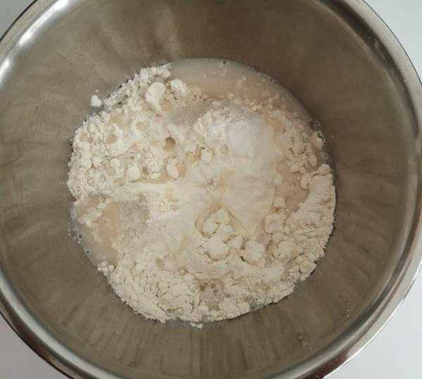 第3步、發酵粉和清水混合均勻,倒入面粉中,和成軟一些的面團。