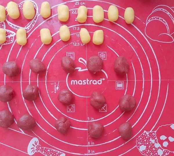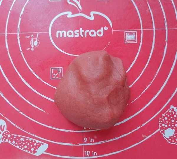 第8步、最大份面團加入紅曲粉揉紅色面團,用色素的話顏色更好看。