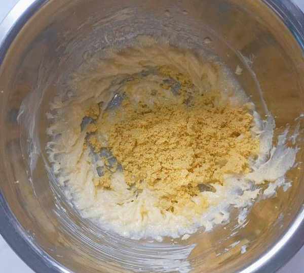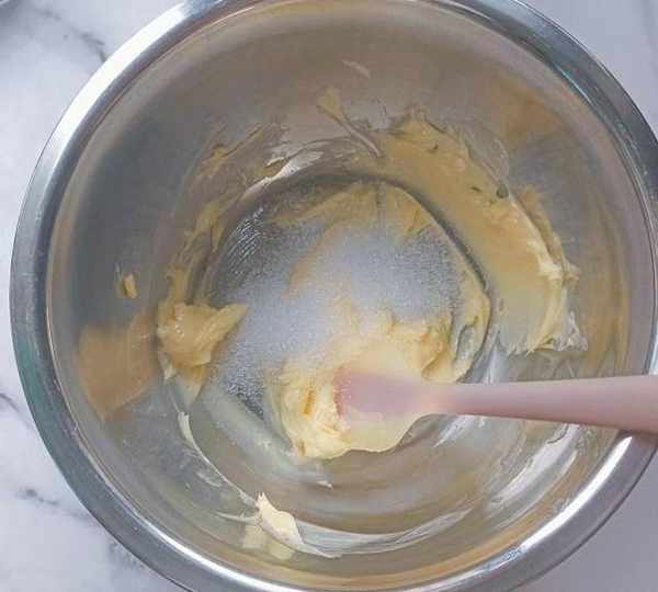 第3步、加入糖粉攪拌均勻,用打蛋器攪打一下。