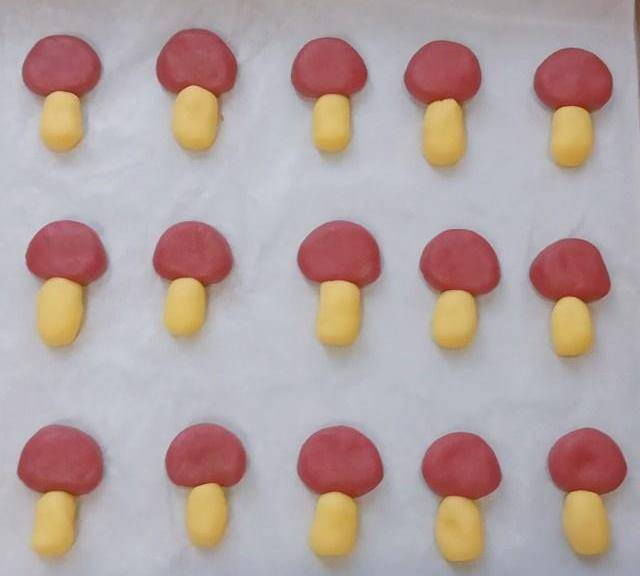 第11步、用最後的那個小面團揉成小圓點點放在蘑菇頭上,最後用大拇指壓扁。