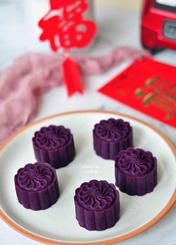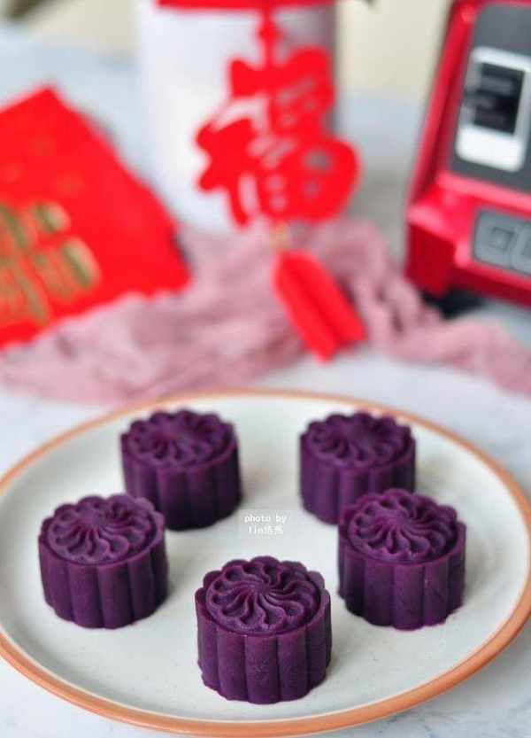 材料:紫薯450g、黃冰糖15g、豆沙餡150g、橄欖油15g