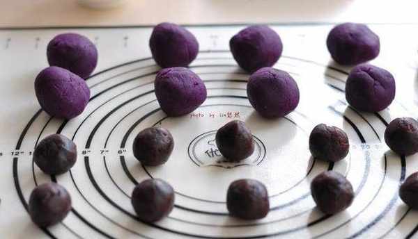 5、將紫薯泥分成一個35g、豆沙餡15g。