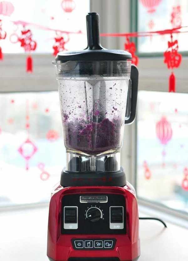 3、用破壁機將紫薯和黃冰糖混合打成泥,過程中從加料口慢慢倒進去橄欖油,用攪拌棒將紫薯泥往中間推,使其充分混合。