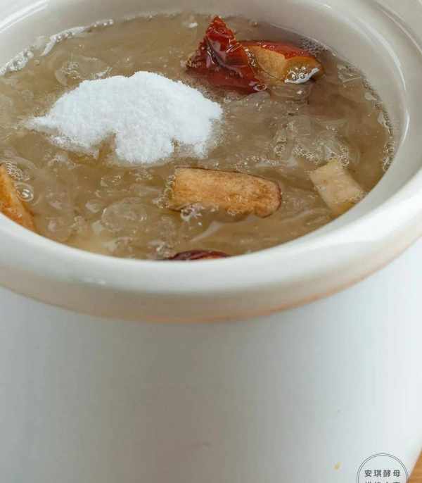 制作的過程非常簡單,前面是和做雪梨銀耳羹同樣的步驟,隻是在銀耳羹出鍋之後,在其中加入白涼粉即可。也不需要特意準備模具,傢裡的碗、杯子都能用,等到凝結成凍之後,用勺子舀著吃就能非常愜意。