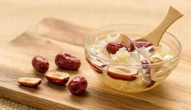 將銀耳提前泡發,泡發後將紅棗、冰糖、銀耳一起熬煮,放涼後即可食用。可以起到止咳潤肺的作用。