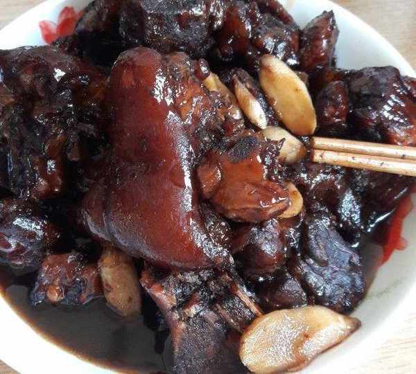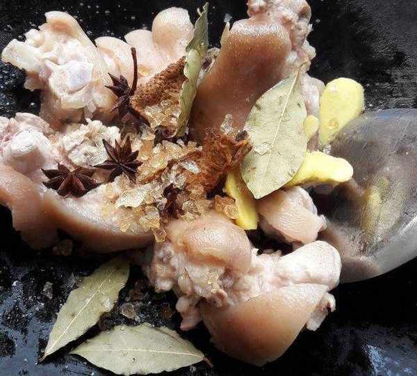 原料:豬腳、鮮薑、酸薑、八角、香葉、冰糖、黑米醋、白醋、醬油。