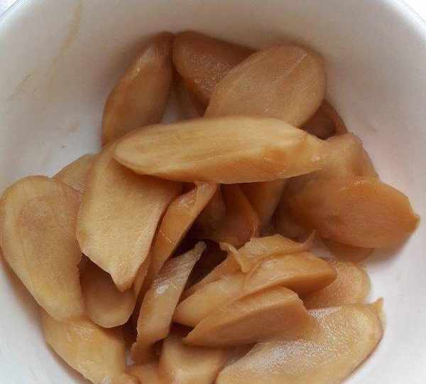 第14步、輕輕的把酸薑拌到豬腳裡,大概就是量熱瞭就好瞭,要不然煮久薑不脆瞭。