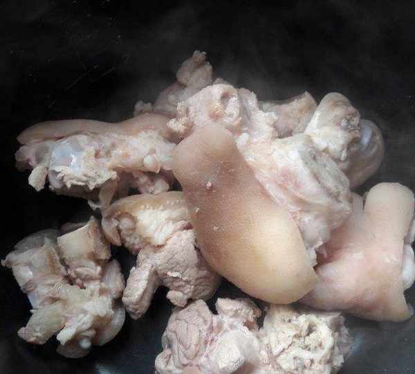 第1步、燒一鍋水,處理好的豬腳過一下水。豬腳可以讓賣豬肉的剁好,回來清洗幹凈。