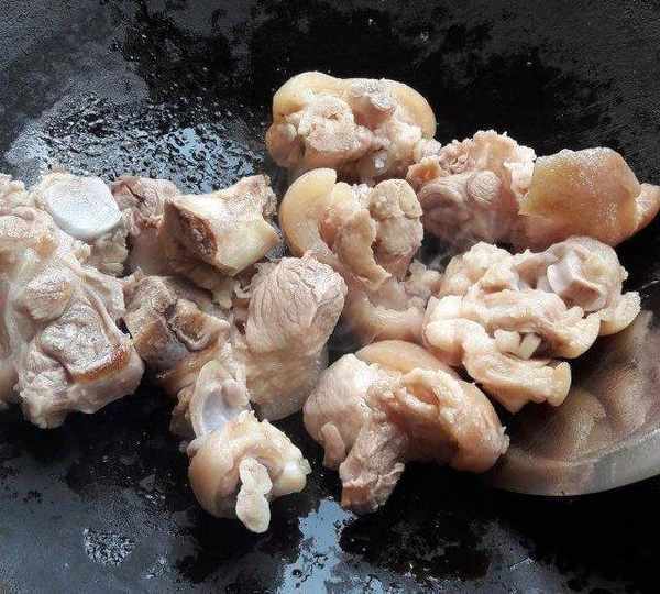 第4步、鍋裡下少許油,小火,豬腳放下去翻炒幾下,如果買到肥的多的話就側重把部分油煸出來。