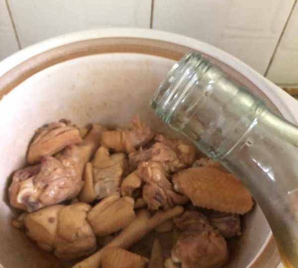 第5步、將醃制過的雞塊放入砂鍋中翻炒出油變色,加入適量的料酒。