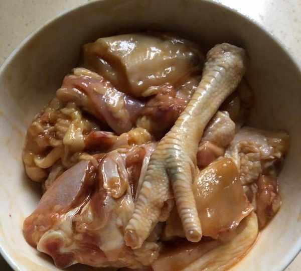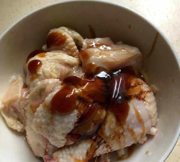 第2步、把剁好的雞塊先用生抽,老抽,鹽,蠔油和油醃制兩小時。