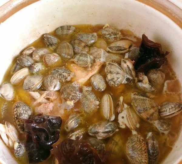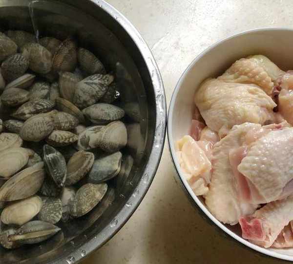 第1步、買紅燒的雞,嫩一些,花甲買回來用鹽水浸泡一小時。