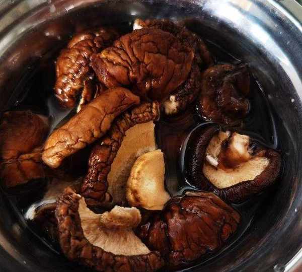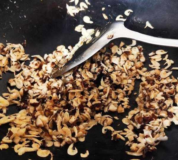 第4步、開火,放油,將蝦皮和香菇炒香變色。