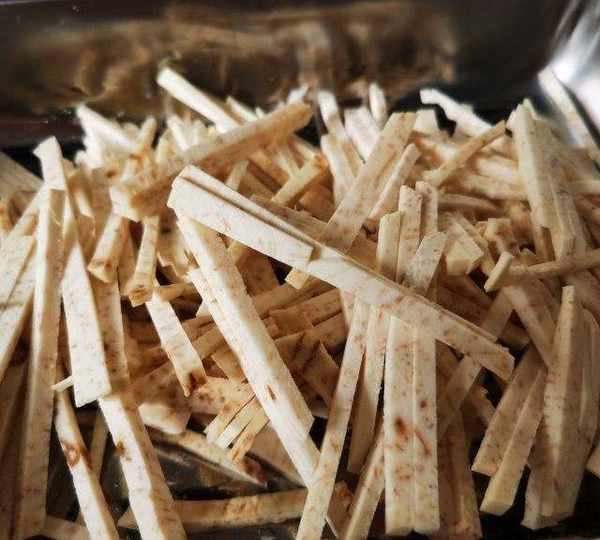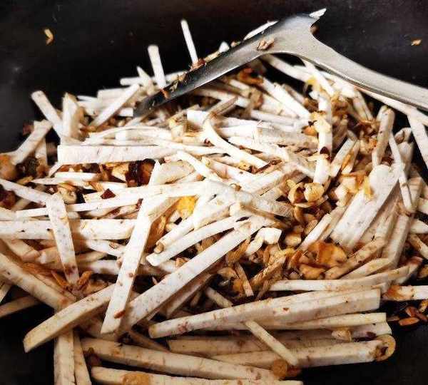 第5步、放入芋頭絲、五香粉、鹽,炒軟。關火放涼。