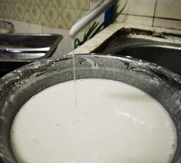 第6步、放涼後加入漿水攪拌均勻。模具盆低及邊緣刷油,以免粘盆。