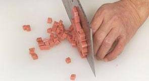 1 將火腿切成條,再切成粒。