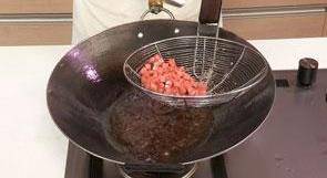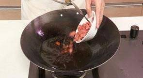 7 油鍋燒至四成熱,倒入火腿粒,炸至米黃色。